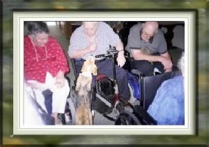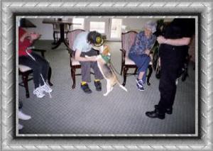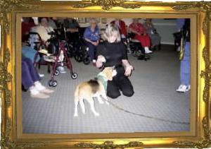 During the last part of the visit Pebs collects treats from all residents. Some make her sit pretty, some play "which hand" and others choose to just let her have the treat.